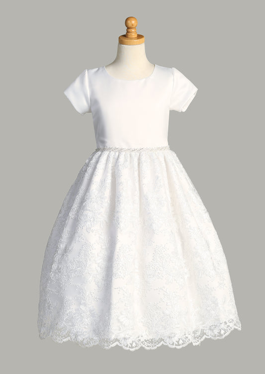 Satin First Communion Dress with Corded Embroidered Tulle and Sequins - SP210