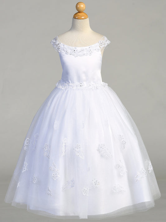 Satin & Glitter Tulle First Communion Dress with Embroidered Appliques - SP711
