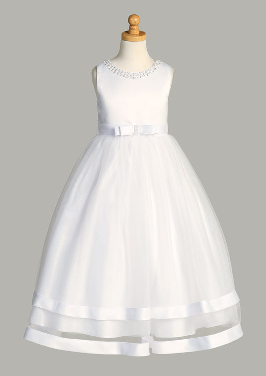 Satin and Glitter Tulle First Communion Dress with Pearl Neckline - SP717