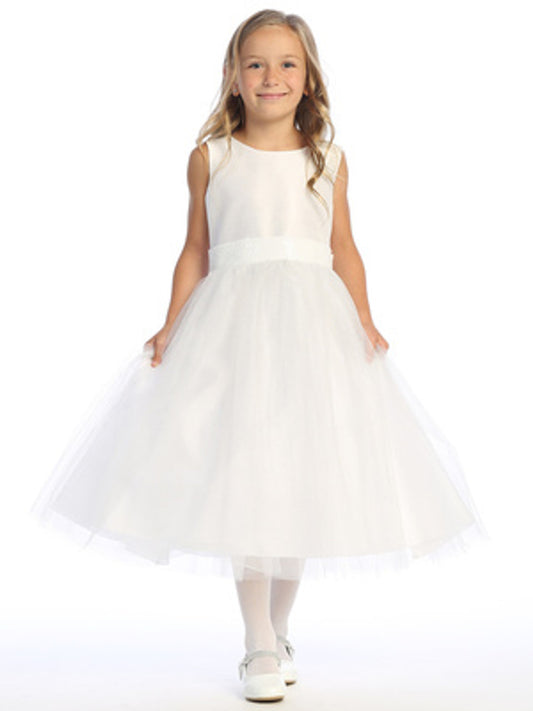 White Shantung and Sparkle Tulle Dress with Sequin Sash - BL255-WHT