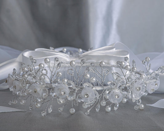 Organza Flowers First Communion Headpiece with Pearls and Rhinestones - T-419