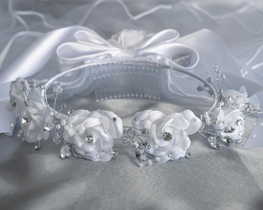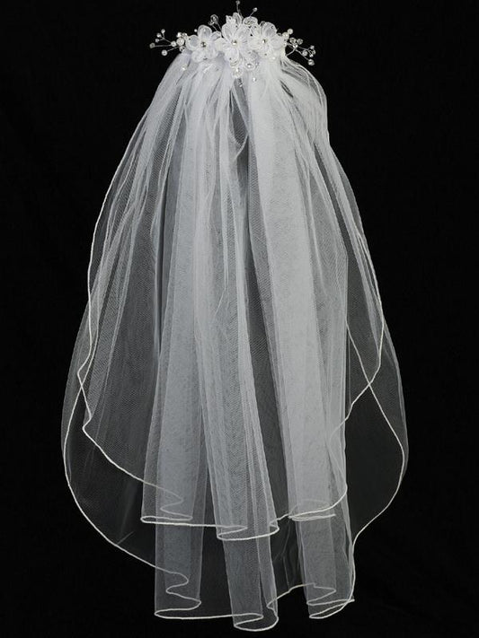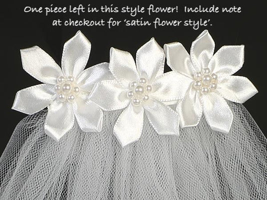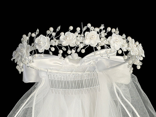 First Communion Veil with Satin Flowers, Rhinestones and Pearls - T-451
