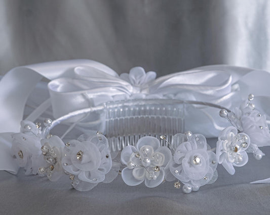 Organza Flower First Communion Headpiece with Rhinestone & Pearls T-441