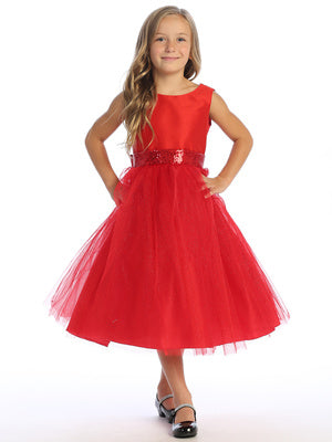 Red Shantung and Sparkle Tulle Dress with Sequin Sash - BL255-RED