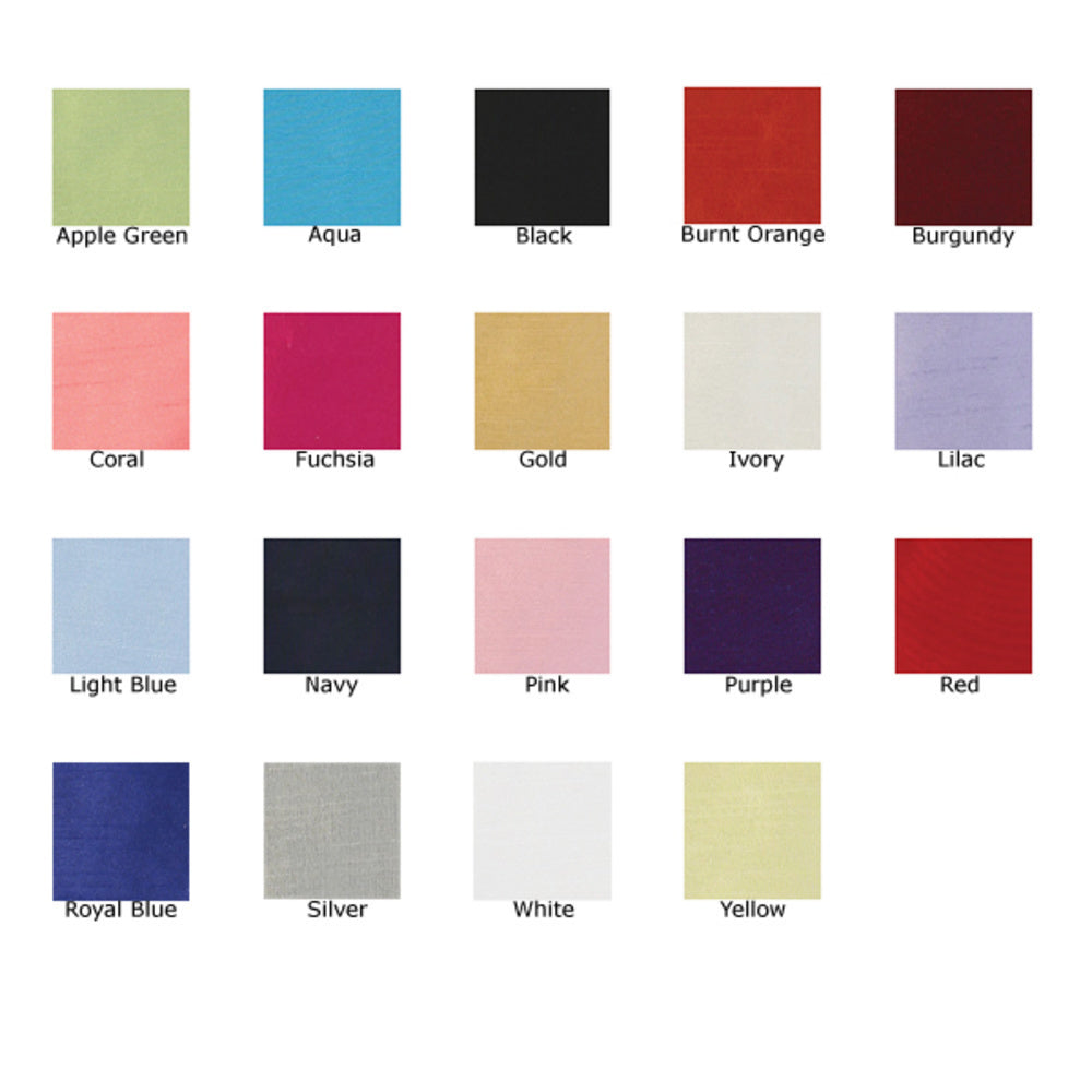 Available colors include Apple Green, Aqua, Black, Burnt Orange, Burgundy, Chocolate, Coral, Fuchsia, Gold, Ivory, Light Blue, Lilac, Navy, Pink, Purple, Red, Royal Blue, Silver, White and Yellow.