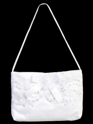 White satin First Communion purse includes corded lace floral applique at the top with organza flower and satin bow. Includes satin strap and snap closure. Purse measures approximately 7 1/2 inches across.