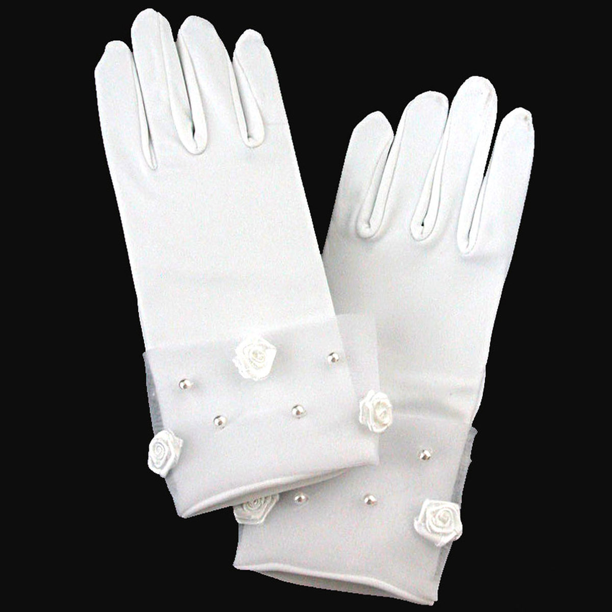 Soft satin short length gloves are adorned with a satin rosettes and pearl detail at the wrist. The perfect finishing touch to her First Communion or Flower Girl outfit!