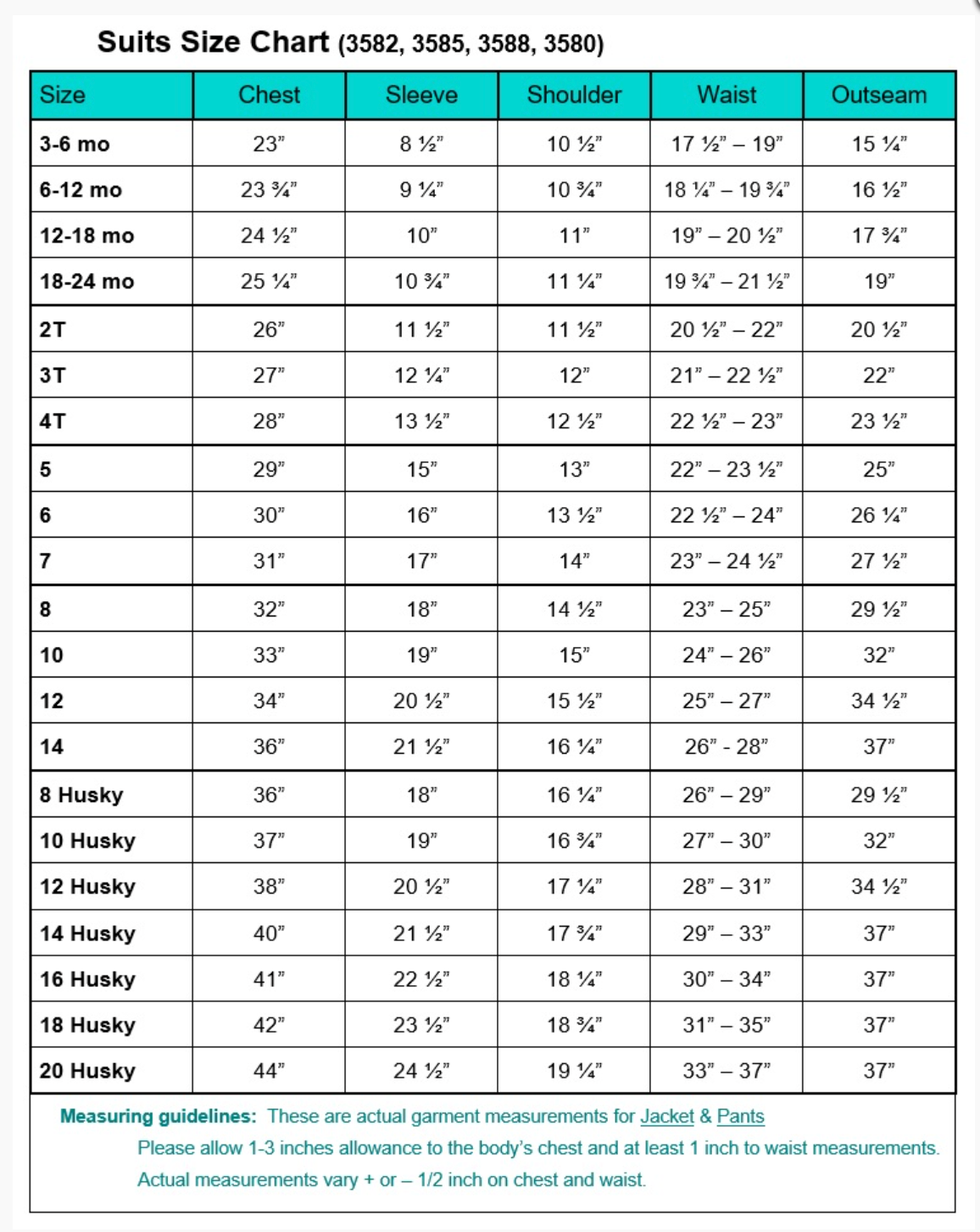 - Pants - Infants and toddler sizes have elastic waist pants, boys sizes have pants with zipper