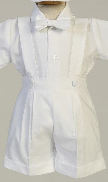 The Blake cotton oxford suspender shorts set is adorable for a christening, wedding or any special occasion! Set includes short sleeve button-down collared shirt, bow-tie and suspendered shorts. Includes matching pageboy cap.