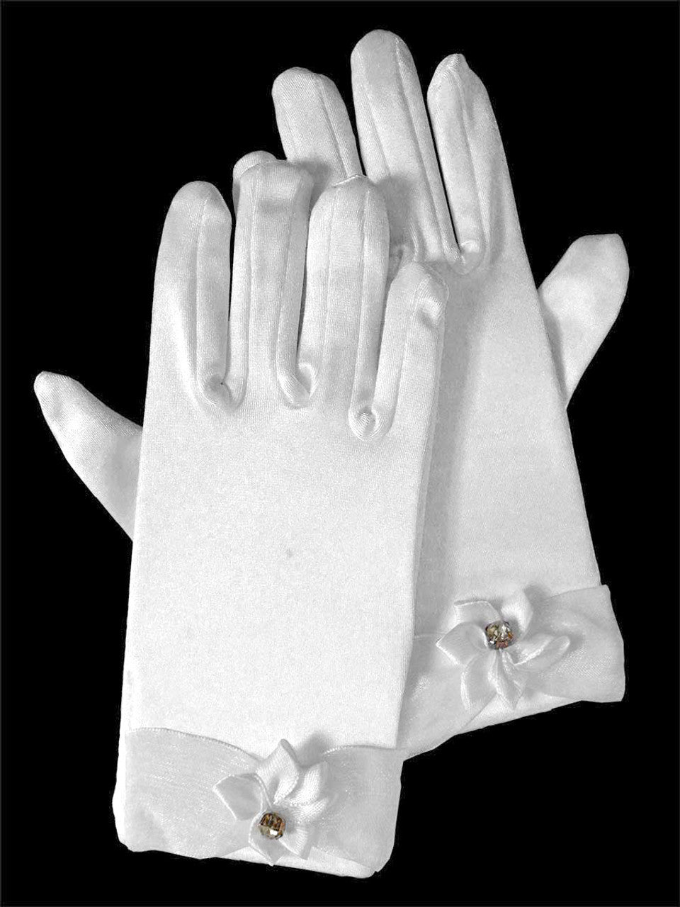 Soft satin short length gloves are adorned with organza cuff with flower and rhinestone accent at the wrist. The perfect finishing touch to her First Communion or Flower Girl outfit!